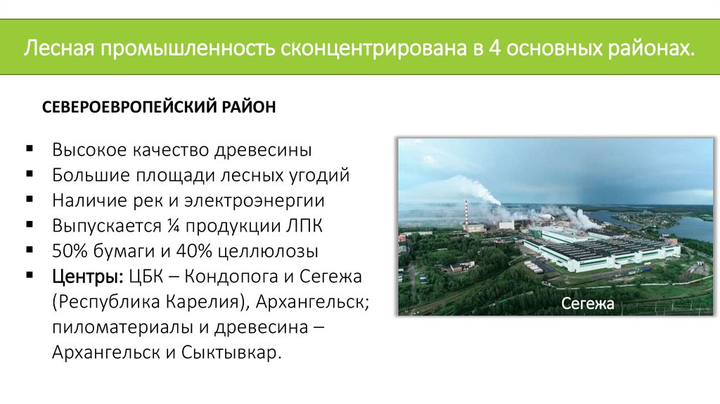 Лесная промышленность сконцентрирована в 4 основных районах.СЕВЕРОЕВРОПЕЙСКИЙ РАЙОН