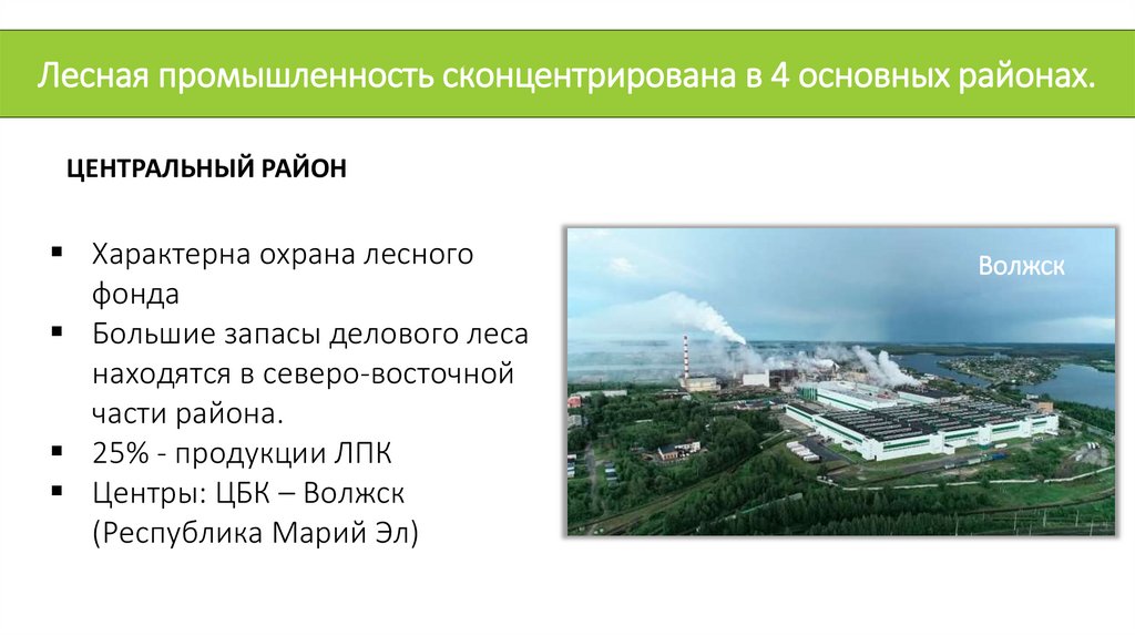 Лесная промышленность сконцентрирована в 4 основных районах.ЦЕНТРАЛЬНЫЙ РАЙОН