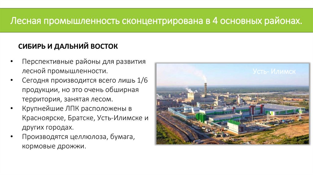 Лесная промышленность сконцентрирована в 4 основных районах.СИБИРЬ И ДАЛЬНИЙ ВОСТОК