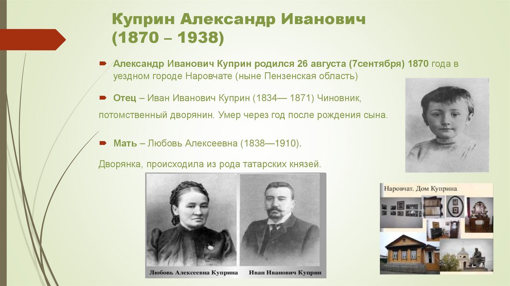 Александр Иванович Куприн родился 26 августа (7сентября) 1870 года вуездном городе Наровчате (ныне Пензенская область)