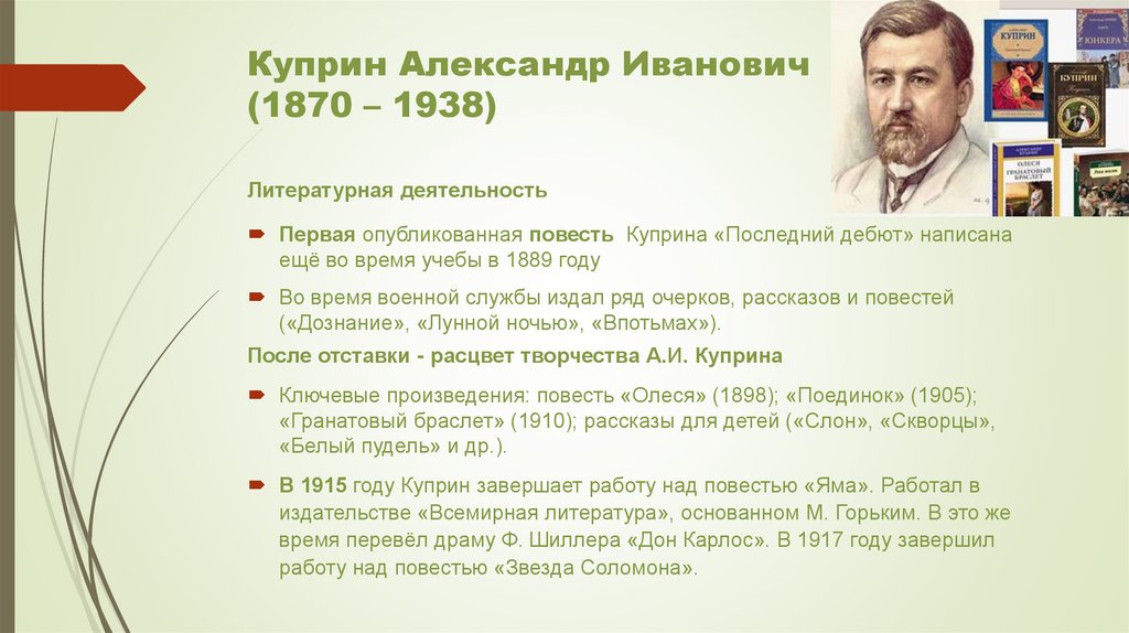 Ключевые произведения: повесть «Олеся» (1898); «Поединок» (1905);