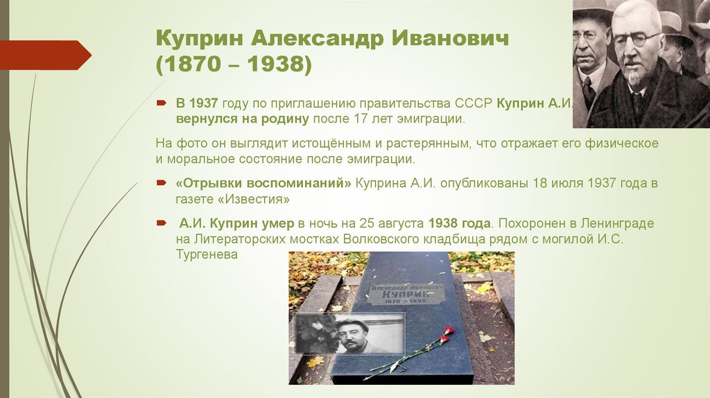 А.И. Куприн умер в ночь на 25 августа 1938 года. Похоронен в Ленинграде