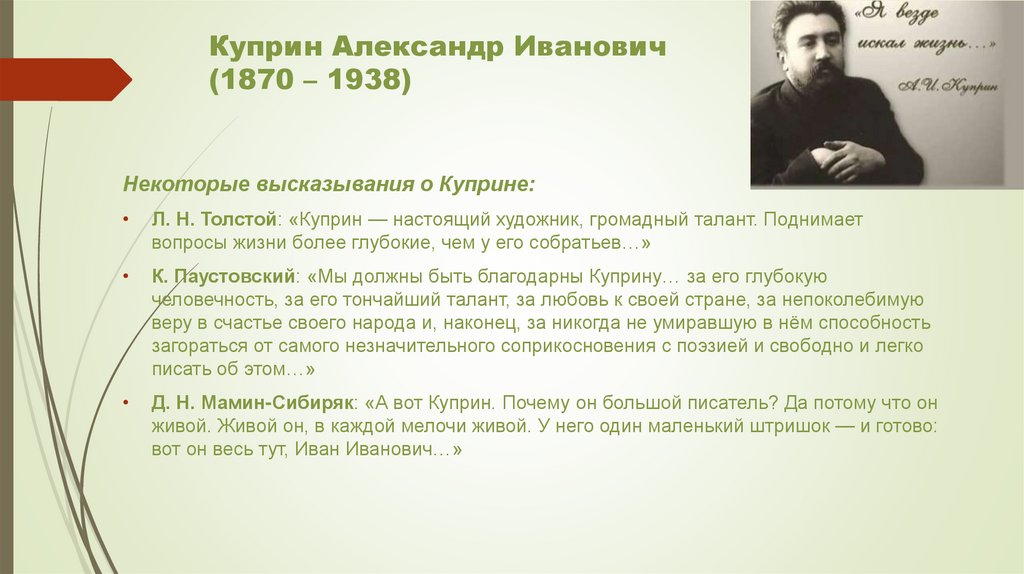 Некоторые высказывания о Куприне:Л. Н. Толстой: «Куприн — настоящий художник, громадный талант. Поднимает