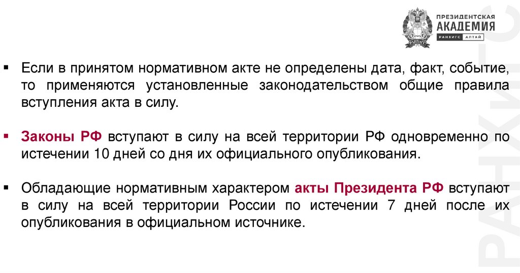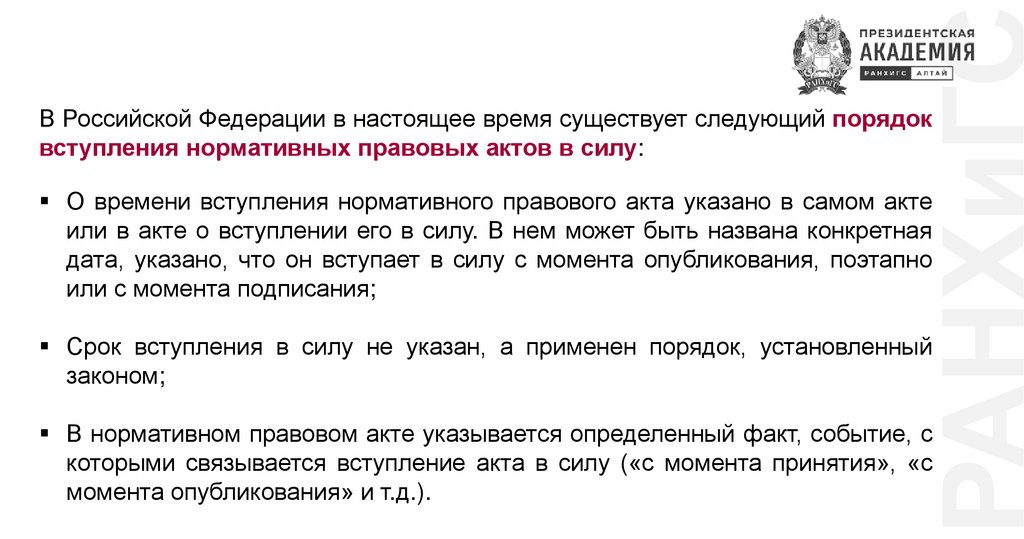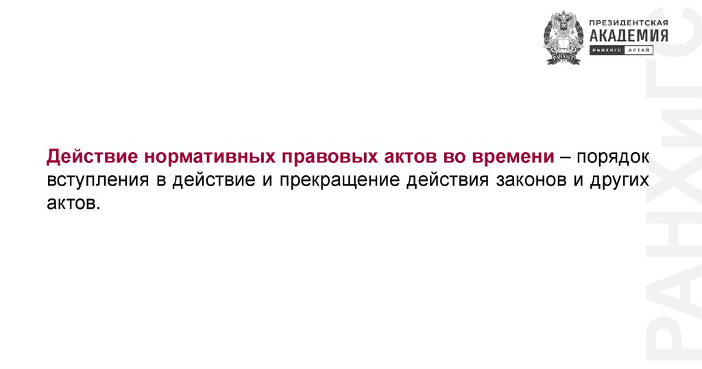РАНХиГСДействие нормативных правовых актов во времени – порядок
