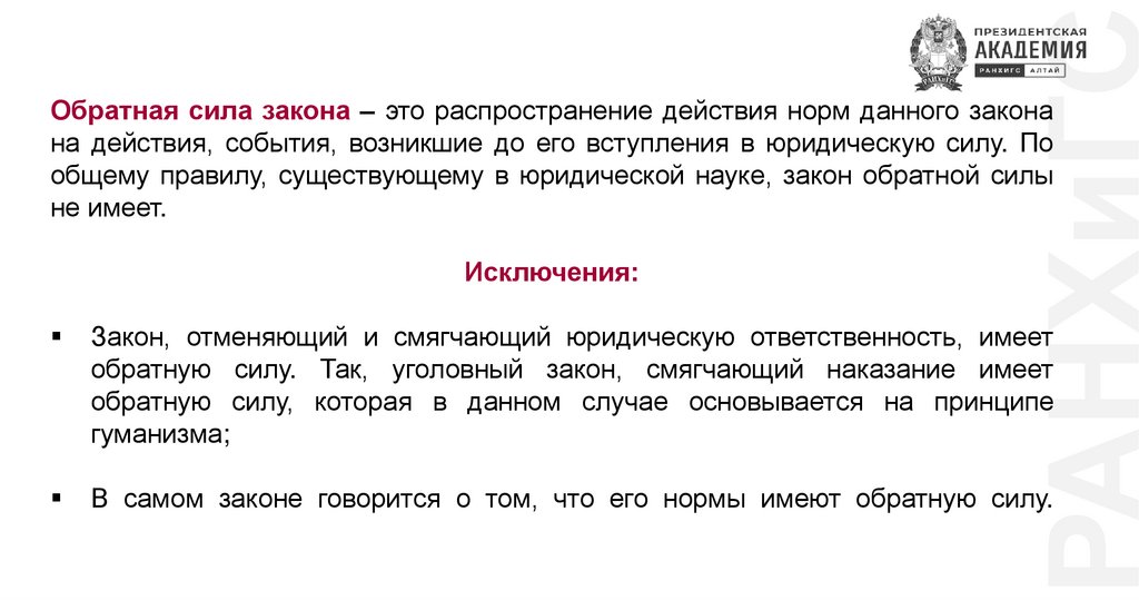 РАНХиГСОбратная сила закона – это распространение действия норм данного закона
