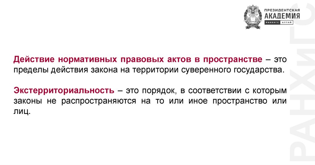 РАНХиГСДействие нормативных правовых актов в пространстве – это