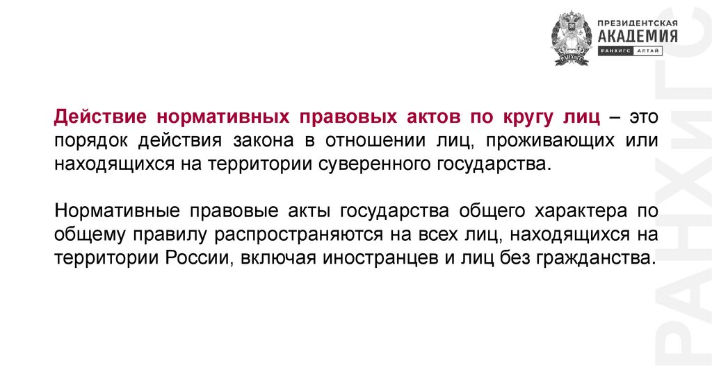 РАНХиГСДействие нормативных правовых актов по кругу лиц – это