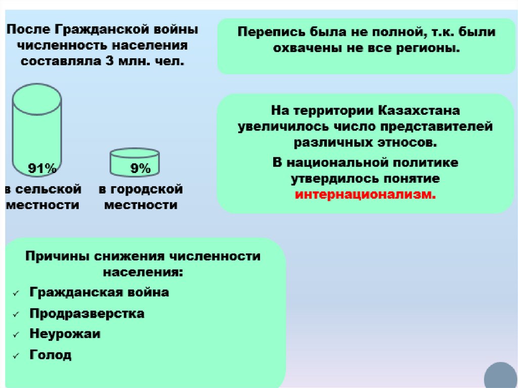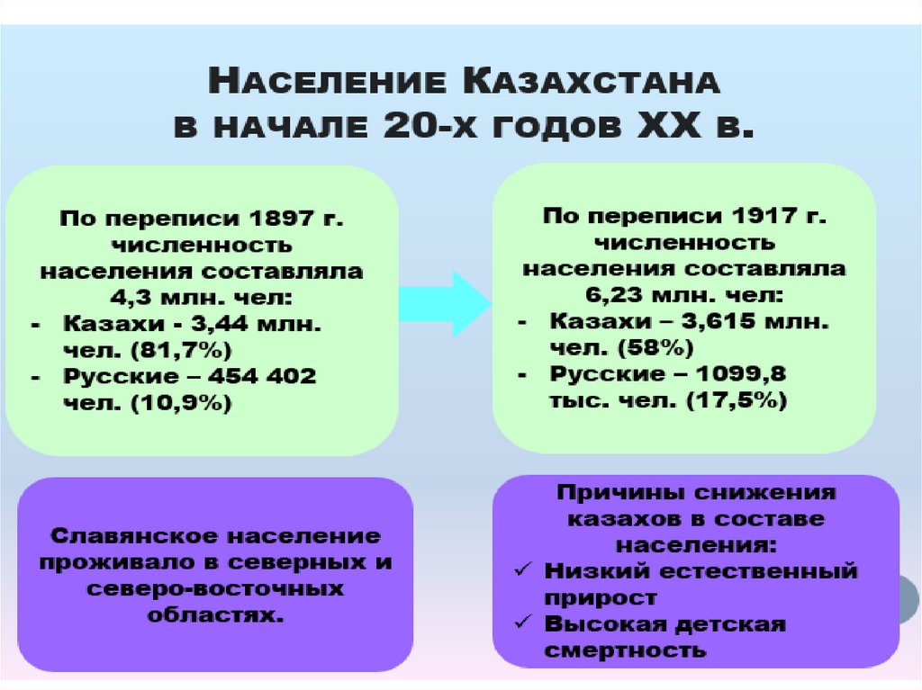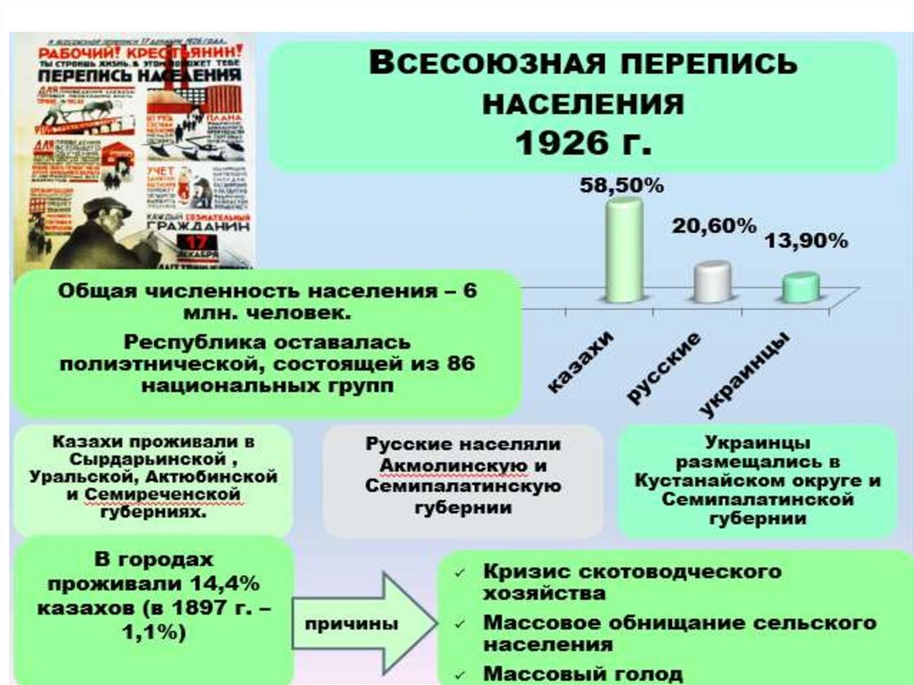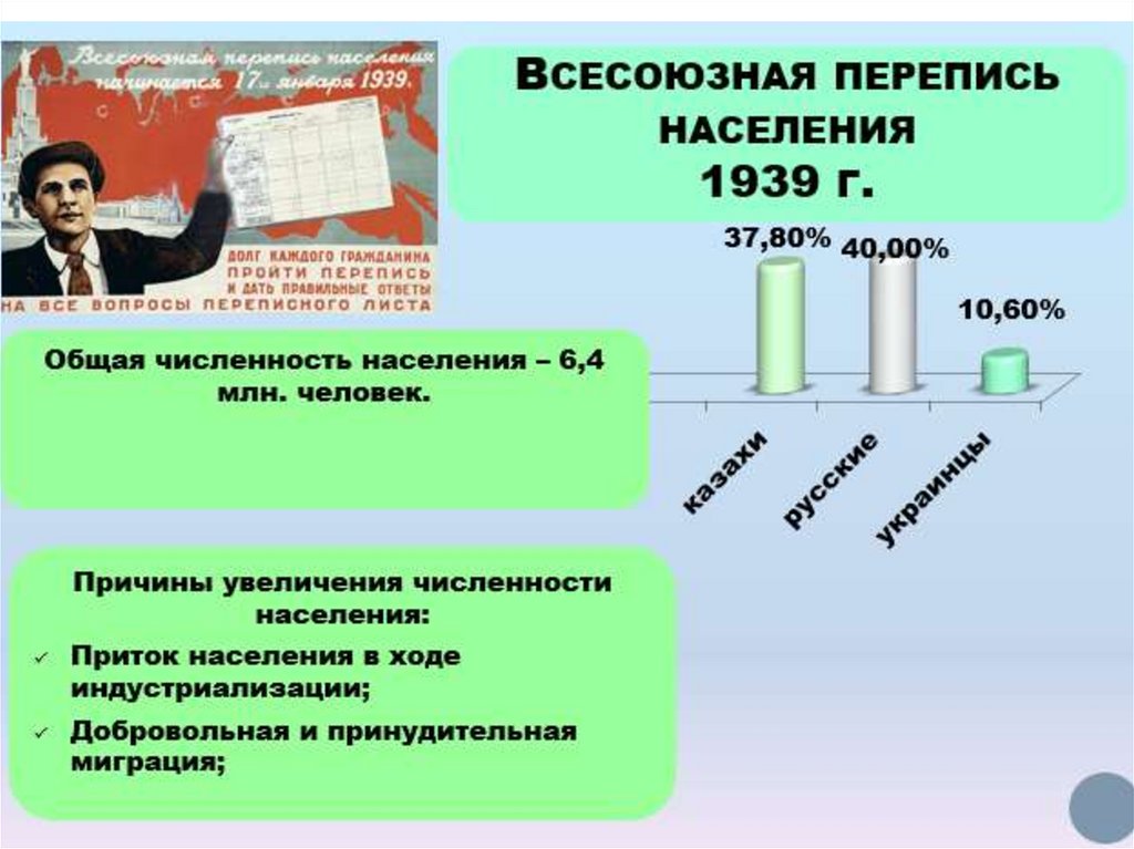 9. По переписи 1937 года в республике проживало 5,1 млн человек: казахов – 42,6%, было …58,5 русских – 37,4%,… 20,6 украинцев –