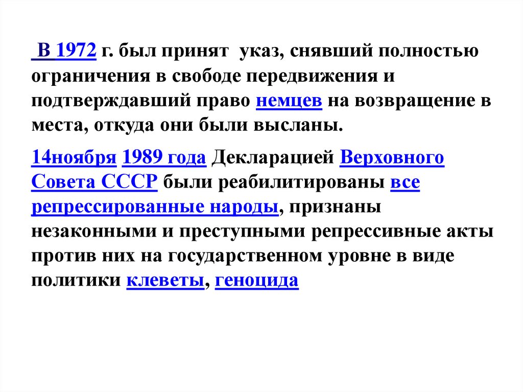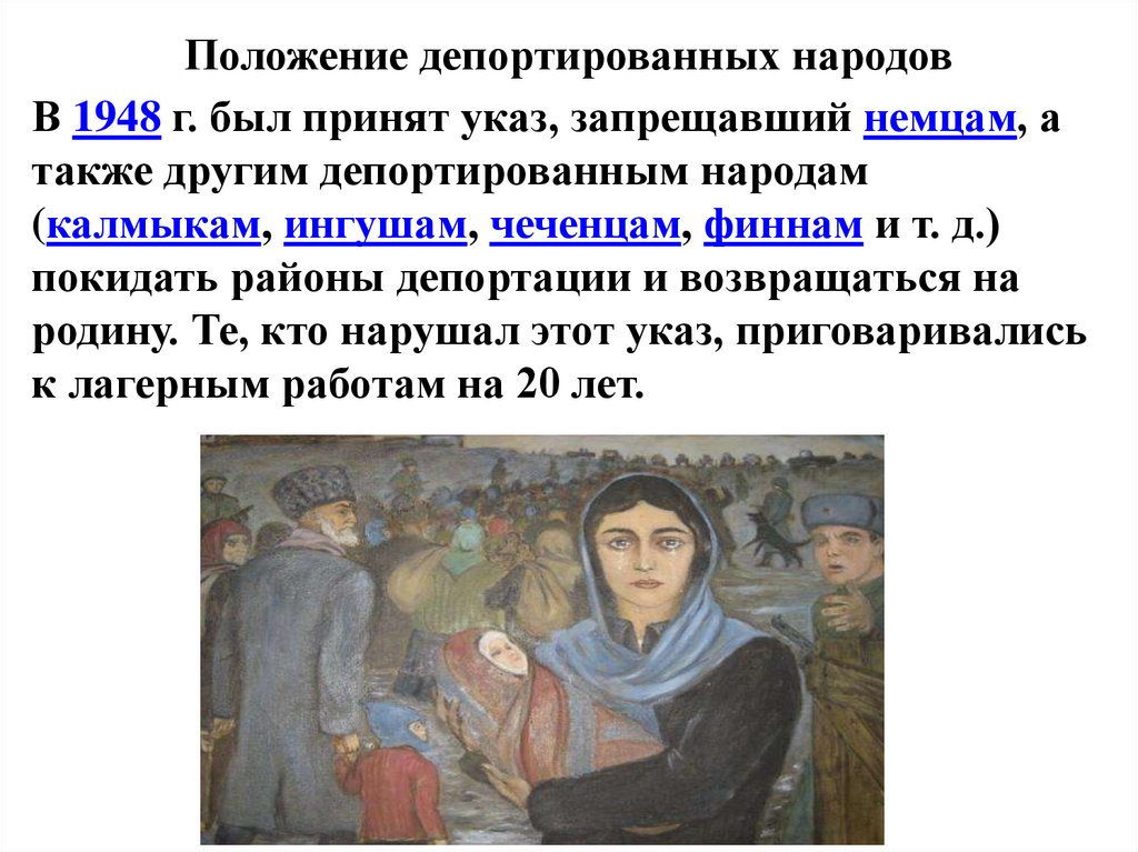 Положение депортированных народовВ 1948 г. был принят указ, запрещавший немцам, а