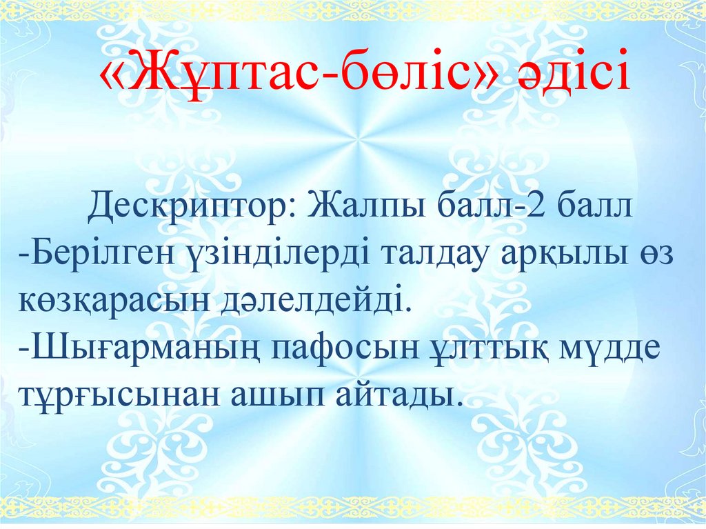 «Жұптас-бөліс» әдісіДескриптор: Жалпы балл-2 балл