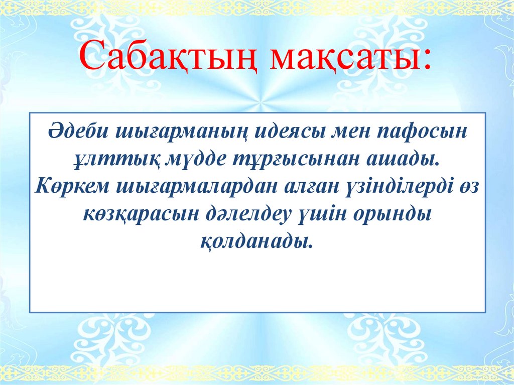 Сабақтың мақсаты:Әдеби шығарманың идеясы мен пафосын