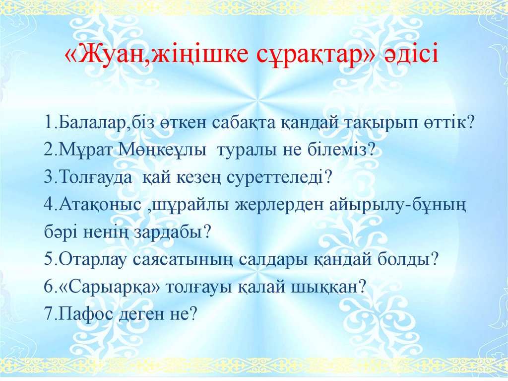 «Жуан,жіңішке сұрақтар» әдісі1.Балалар,біз өткен сабақта қандай тақырып өттік?