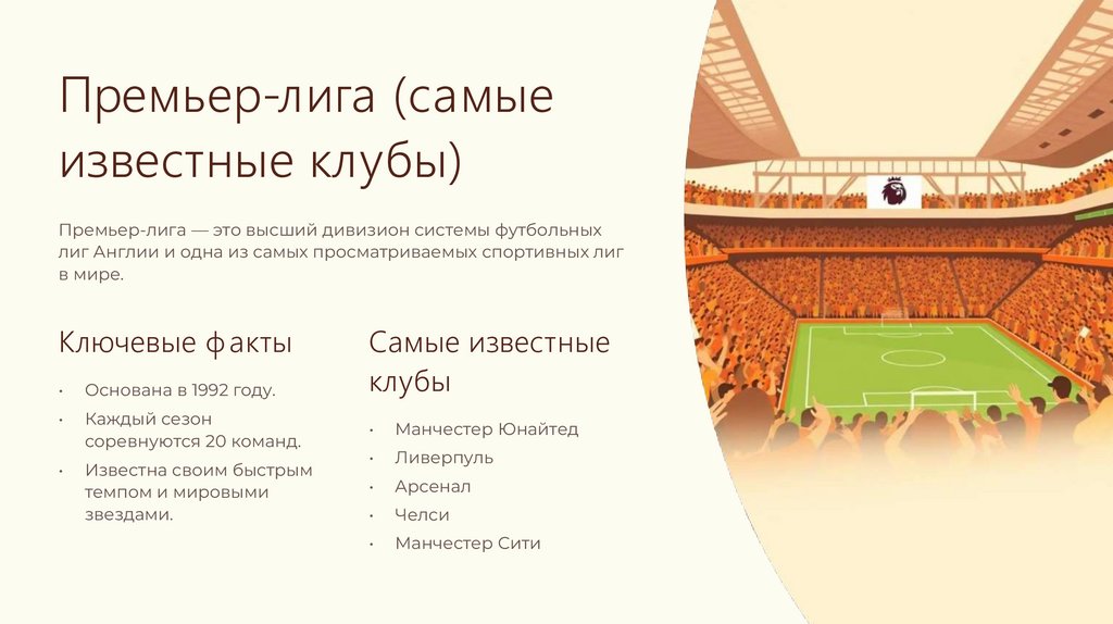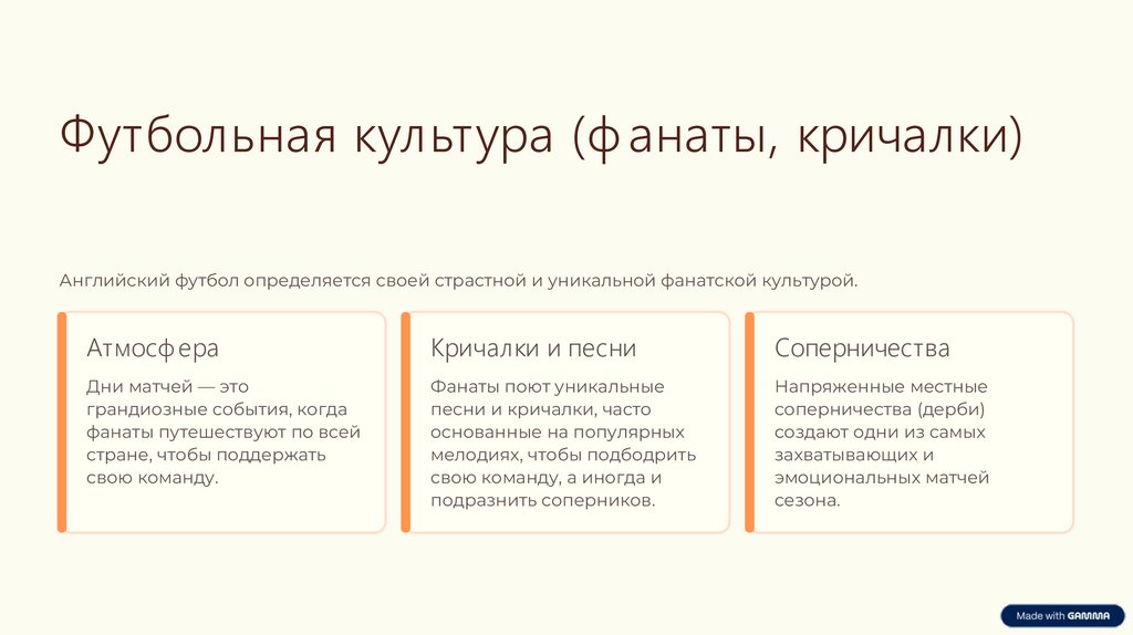 Футбольная культура (ф анаты, кричалки)Английский футбол определяется своей страстной и уникальной фанатской культурой.