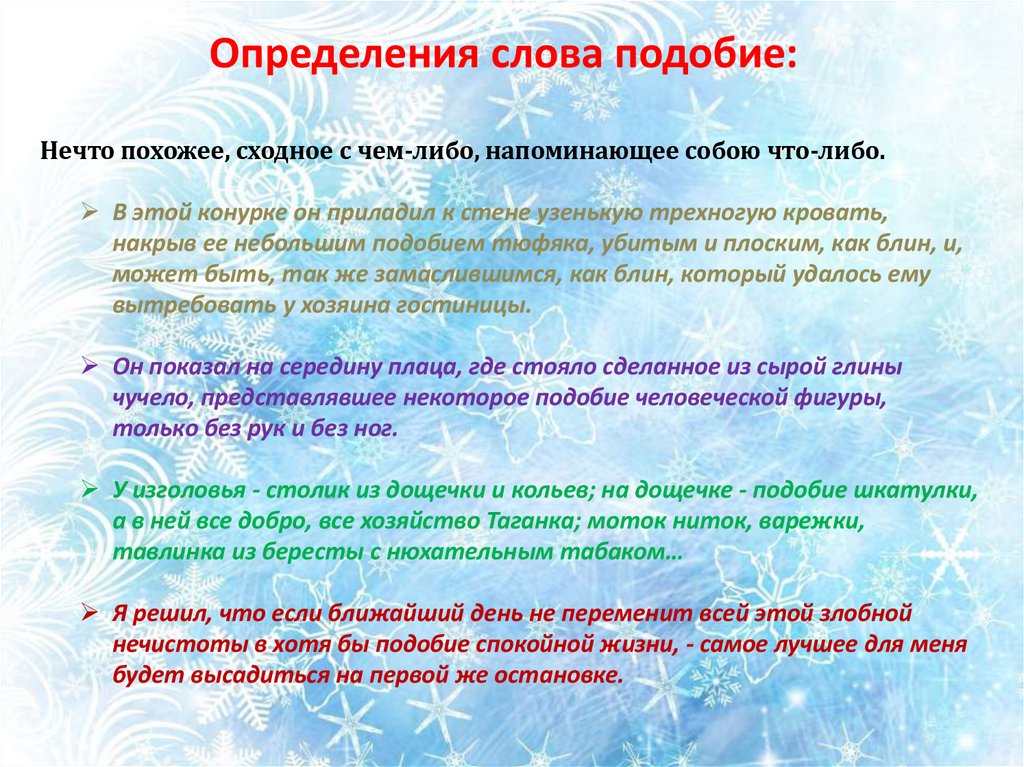 Определения слова подобие:Нечто похожее, сходное с чем-либо, напоминающее собою что-либо.
