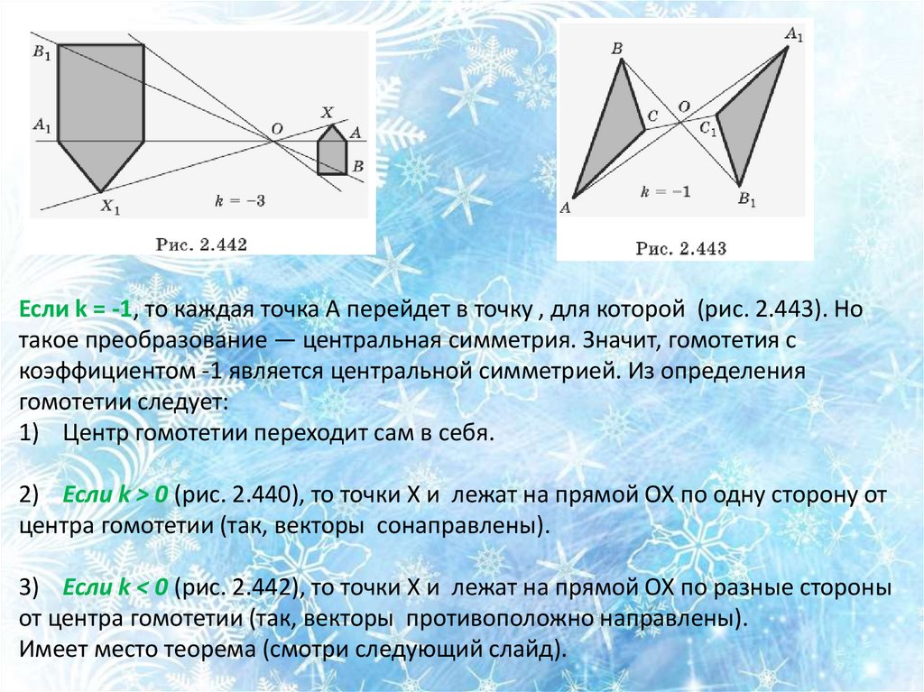Если k = -1, то каждая точка А перейдет в точку , для которой (рис. 2.443). Нотакое преобразование — центральная симметрия. Значит, гомотетия с