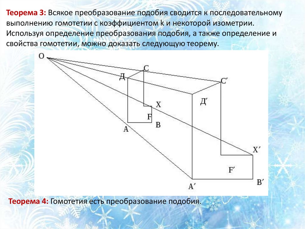 Теорема 3: Всякое преобразование подобия сводится к последовательномувыполнению гомотетии с коэффициентом k и некоторой изометрии.