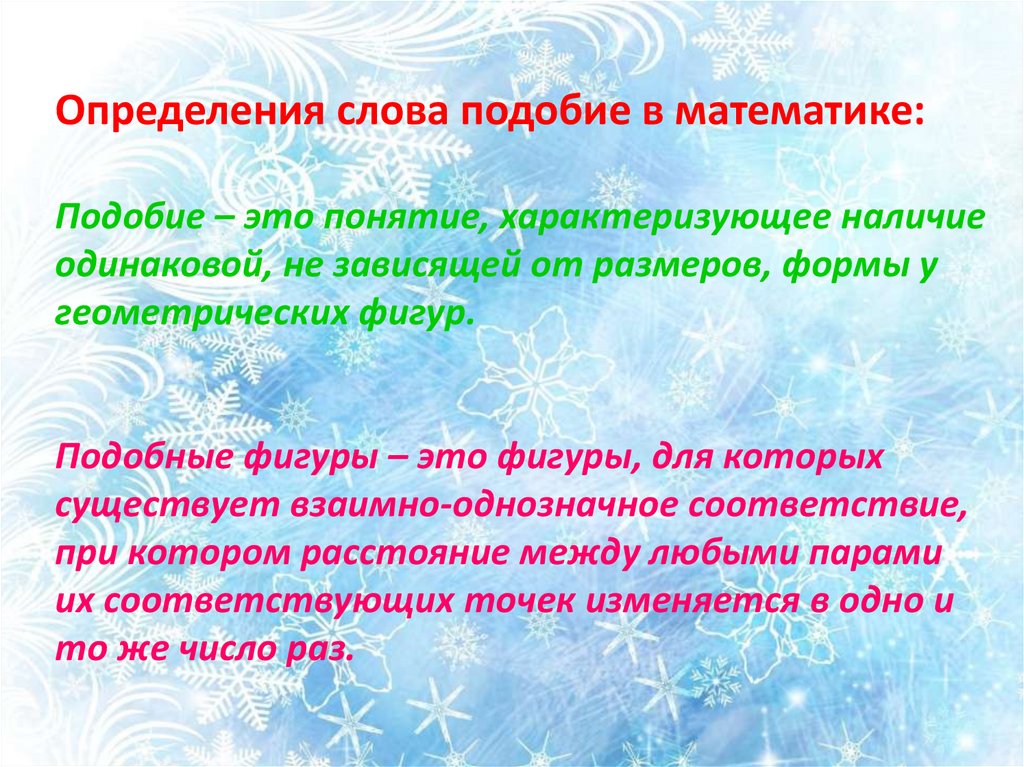 Определения слова подобие в математике:Подобие – это понятие, характеризующее наличие