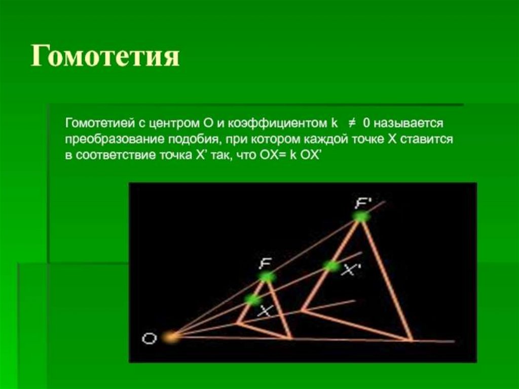 Определение:Гомотетией с центром O и коэффициентом называют преобразование, при