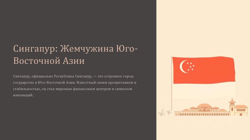 Сингапур: Жемчужина ЮгоВосточной АзииСингапур, официально Республика Сингапур, — это островное городгосударство в Юго-Восточной Азии. Известный своим процветанием и