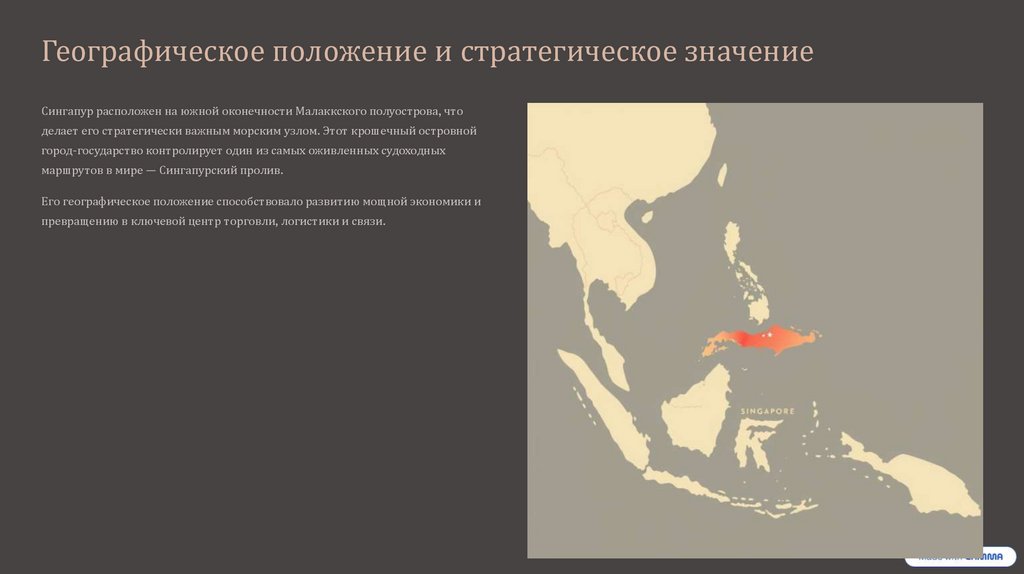 Географическое положение и стратегическое значениеСингапур расположен на южной оконечности Малаккского полуострова, что