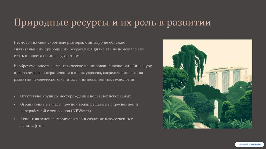 Природные ресурсы и их роль в развитииНесмотря на свои скромные размеры, Сингапур не обладает
