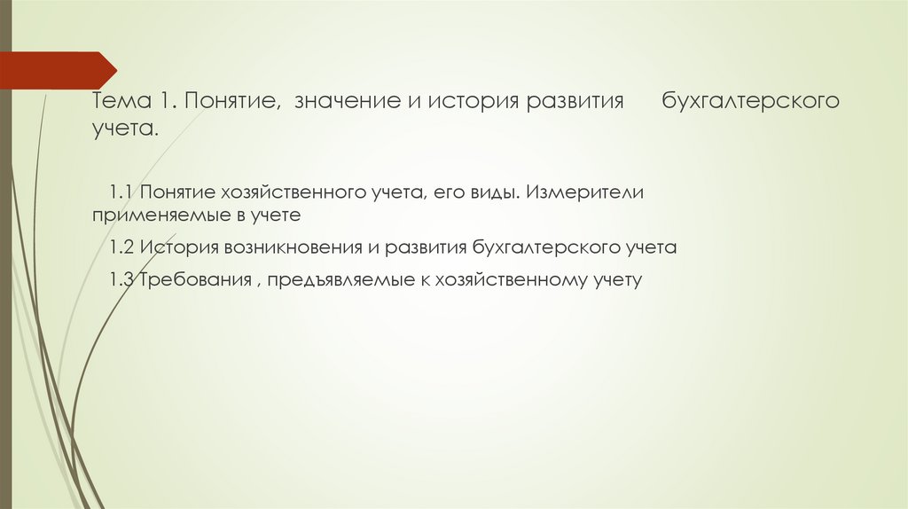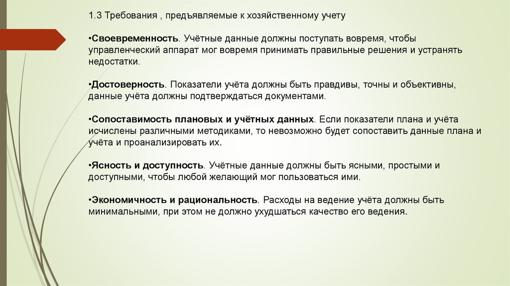 1.3 Требования , предъявляемые к хозяйственному учету•Своевременность. Учётные данные должны поступать вовремя, чтобы