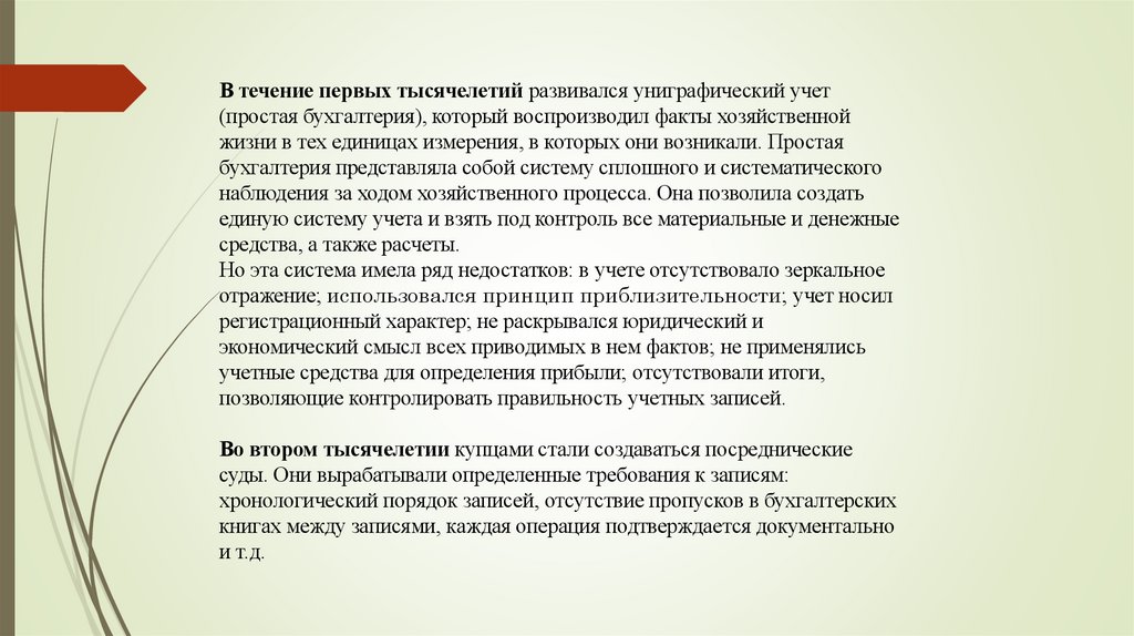 В течение первых тысячелетий развивался униграфический учет(простая бухгалтерия), который воспроизводил факты хозяйственной