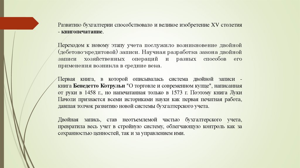 Развитию бухгалтерии способствовало и великое изобретение XV столетия- книгопечатание.