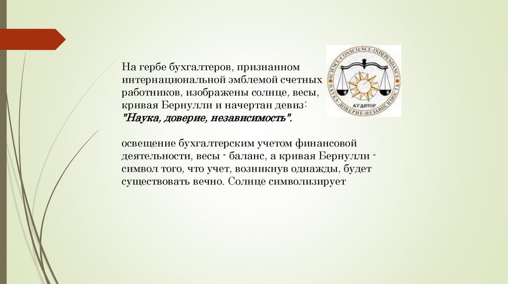 деятельности, весы - баланс, а кривая Бернулли символ того, что учет, возникнув однажды, будет