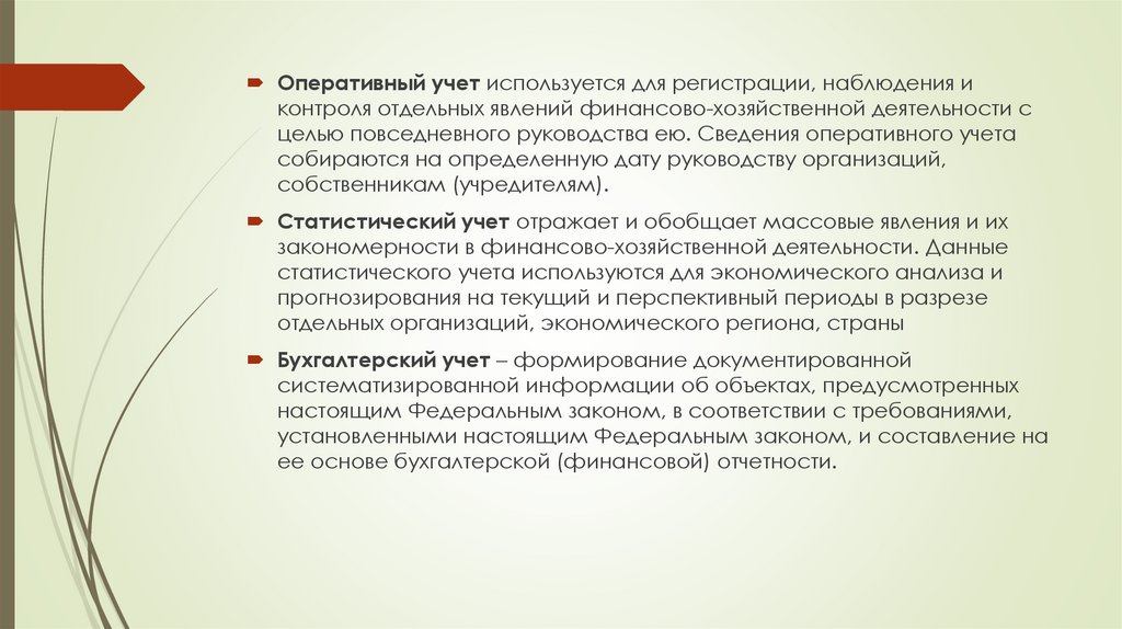 Оперативный учет используется для регистрации, наблюдения иконтроля отдельных явлений финансово-хозяйственной деятельности с