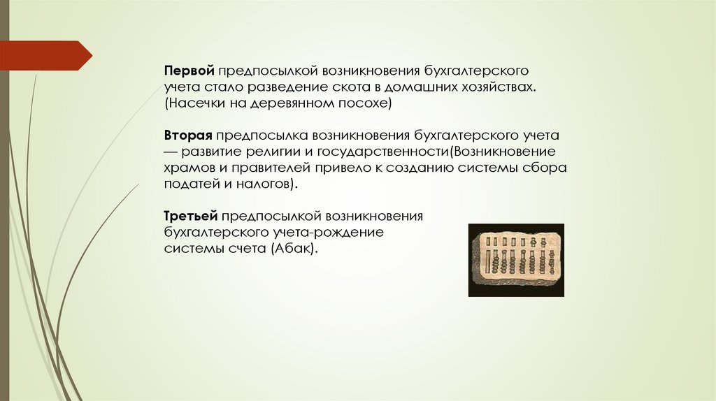 Первой предпосылкой возникновения бухгалтерскогоучета стало разведение скота в домашних хозяйствах.