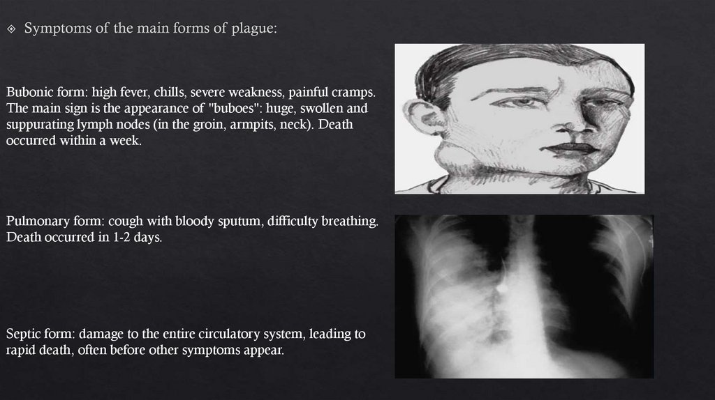 Bubonic form: high fever, chills, severe weakness, painful cramps.The main sign is the appearance of "buboes": huge, swollen and
