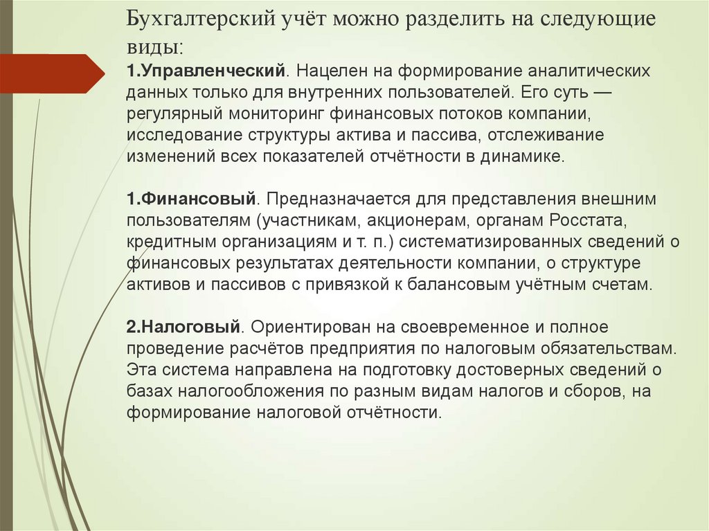 Бухгалтерский учёт можно разделить на следующиевиды:
