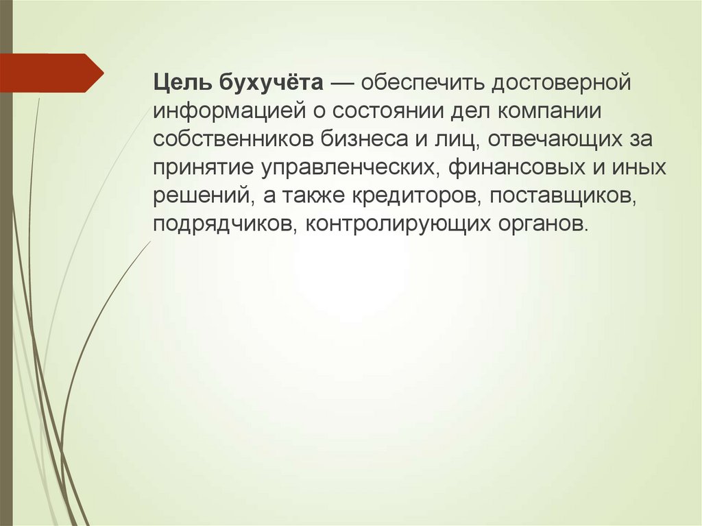 Цель бухучёта — обеспечить достовернойинформацией о состоянии дел компании