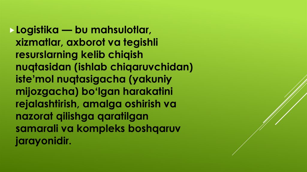 Logistika — bu mahsulotlar,xizmatlar, axborot va tegishli