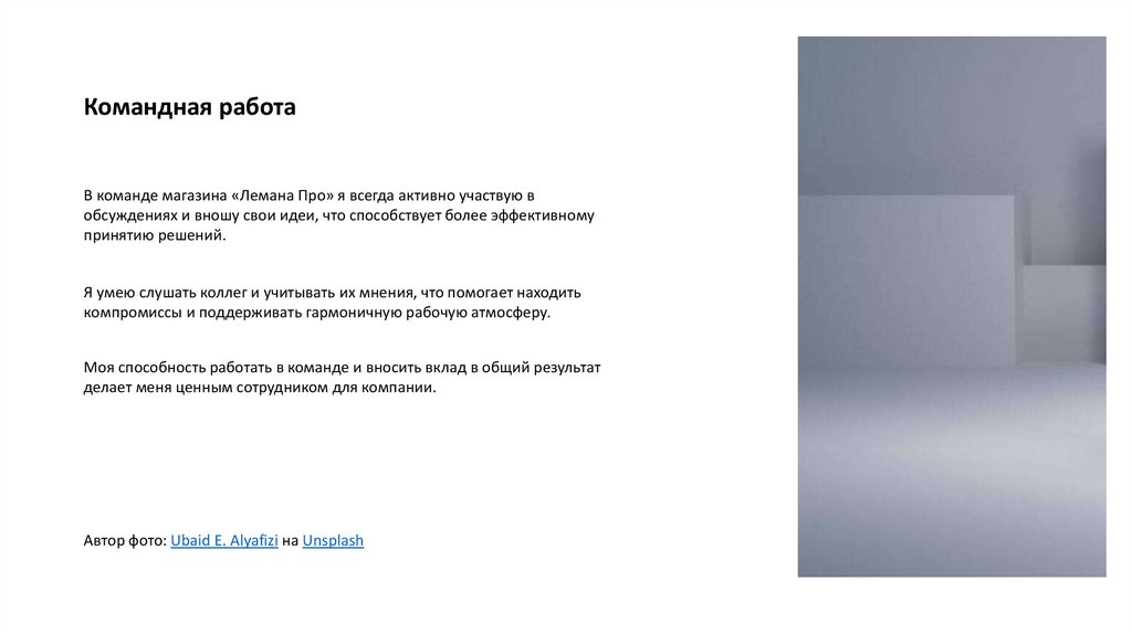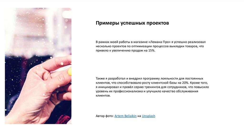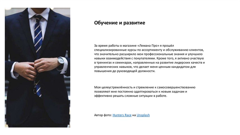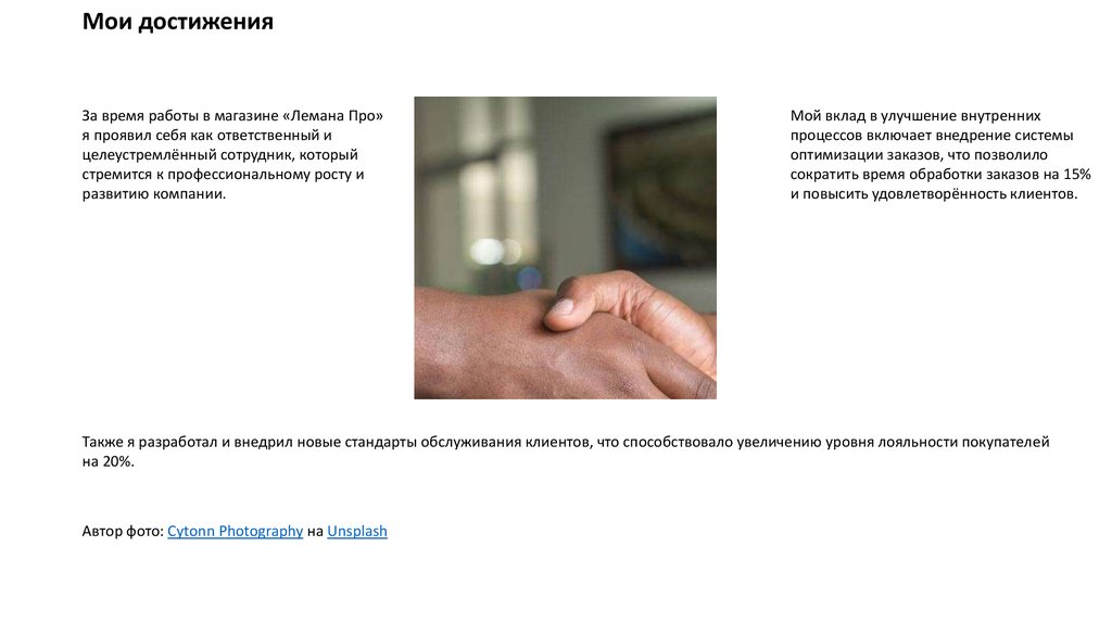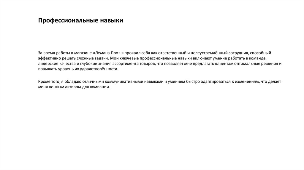 Профессиональные навыкиЗа время работы в магазине «Лемана Про» я проявил себя как ответственный и целеустремлённый сотрудник, способный