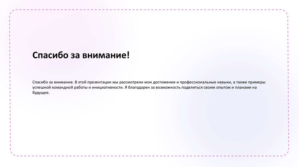 Спасибо за внимание!Спасибо за внимание. В этой презентации мы рассмотрели мои достижения и профессиональные навыки, а также примеры