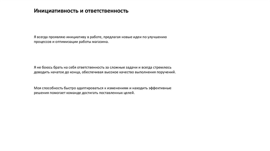 Инициативность и ответственностьЯ всегда проявляю инициативу в работе, предлагая новые идеи по улучшению