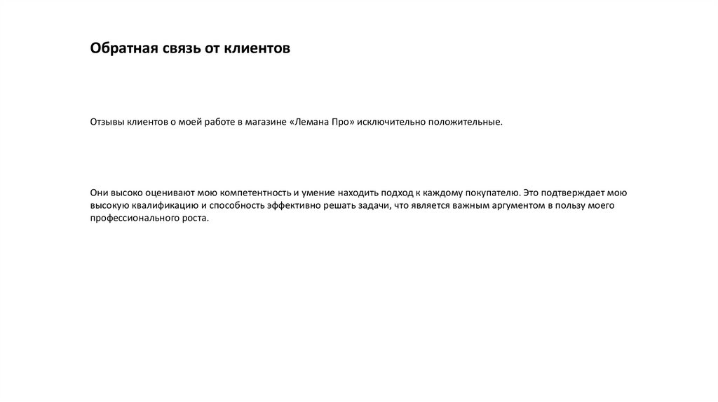 Обратная связь от клиентовОтзывы клиентов о моей работе в магазине «Лемана Про» исключительно положительные.