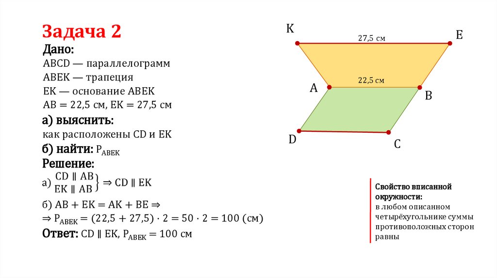 ⇒ PABEK = (22,5 + 27,5) · 2 = 50 · 2 = 100 (см)