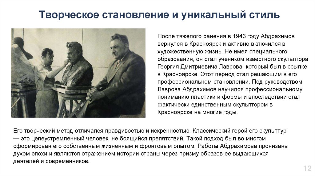 Творческое становление и уникальный стильПосле тяжелого ранения в 1943 году Абдрахимов