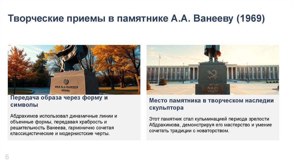 Творческие приемы в памятнике А.А. Ванееву (1969)Передача образа через форму и