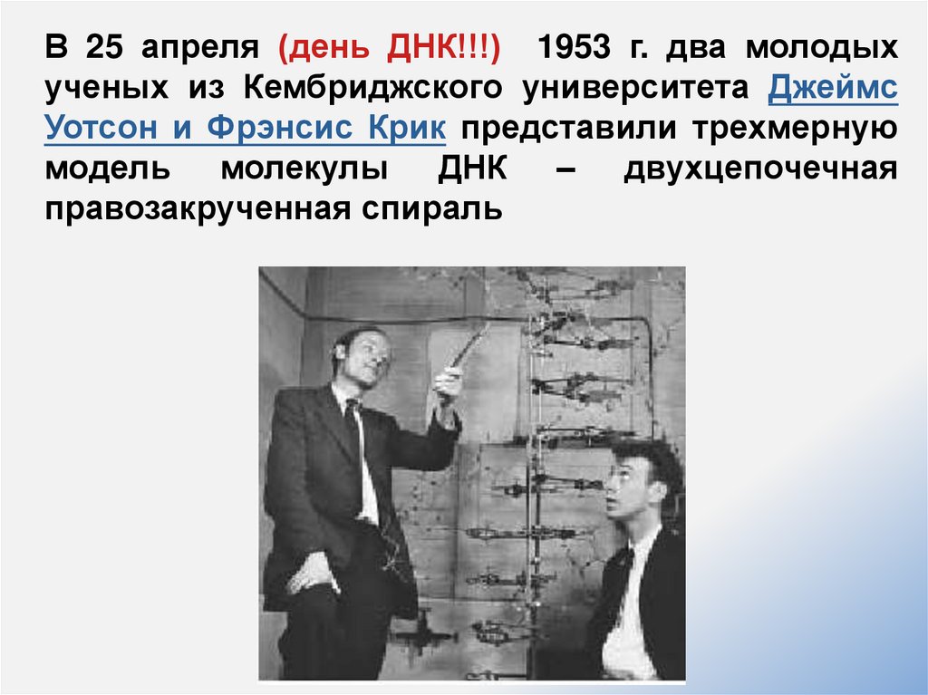 В 25 апреля (день ДНК!!!) 1953 г. два молодыхученых из Кембриджского университета Джеймс