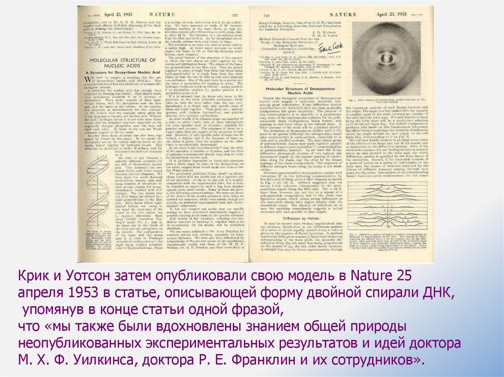 Крик и Уотсон затем опубликовали свою модель в Nature 25апреля 1953 в статье, описывающей форму двойной спирали ДНК,
