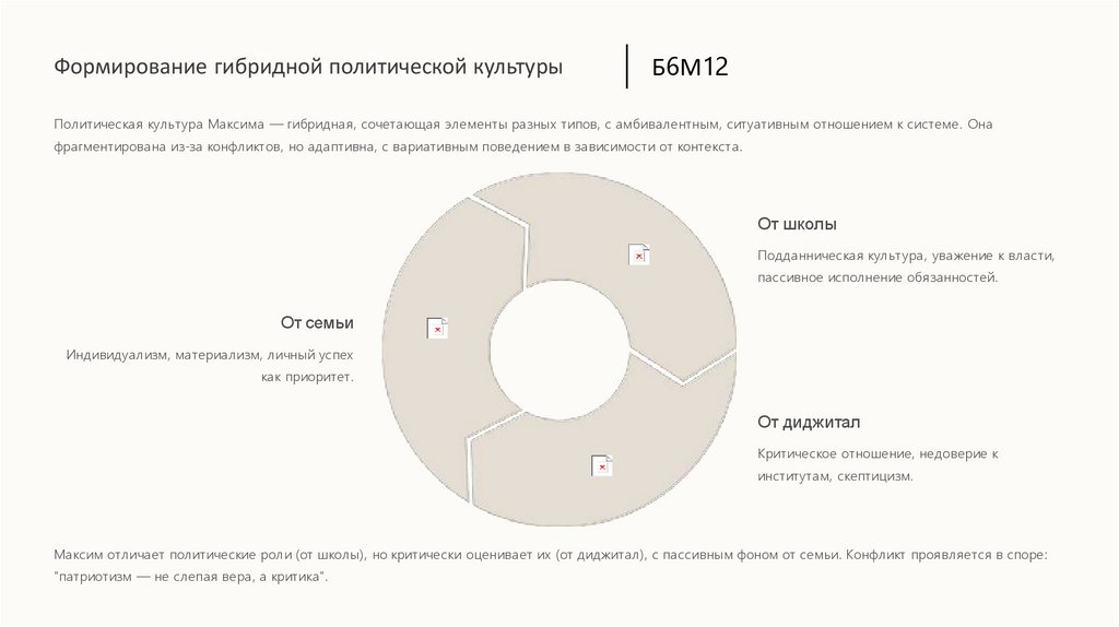 Максим отличает политические роли (от школы), но критически оценивает их (от диджитал), с пассивным фоном от семьи. Конфликт проявляется в споре: