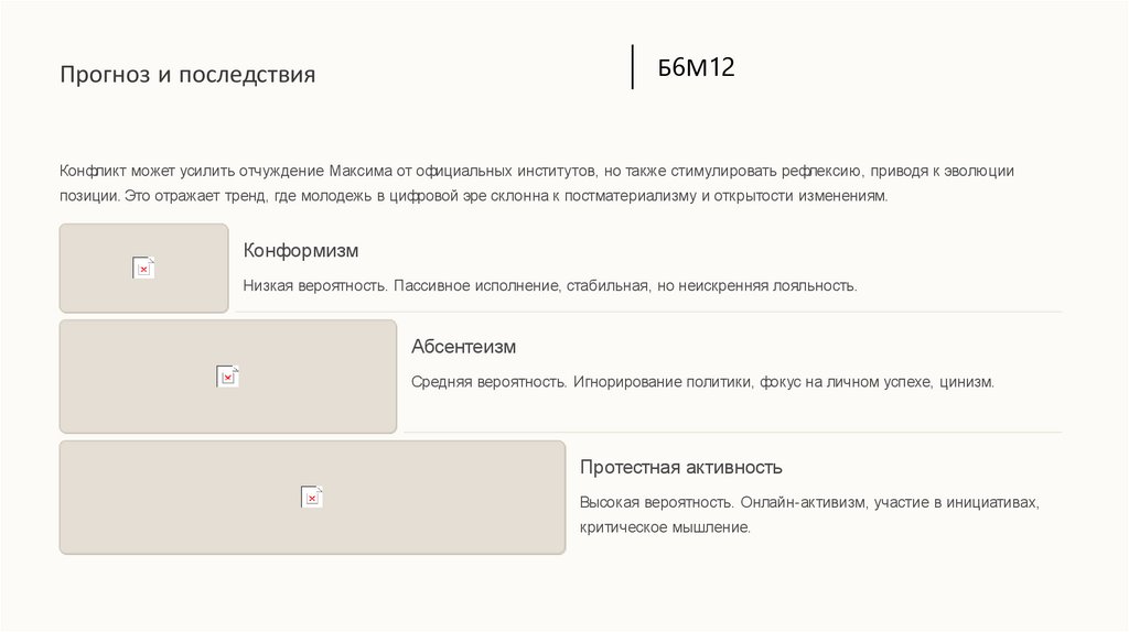 Конфликт может усилить отчуждение Максима от официальных институтов, но также стимулировать рефлексию, приводя к эволюции