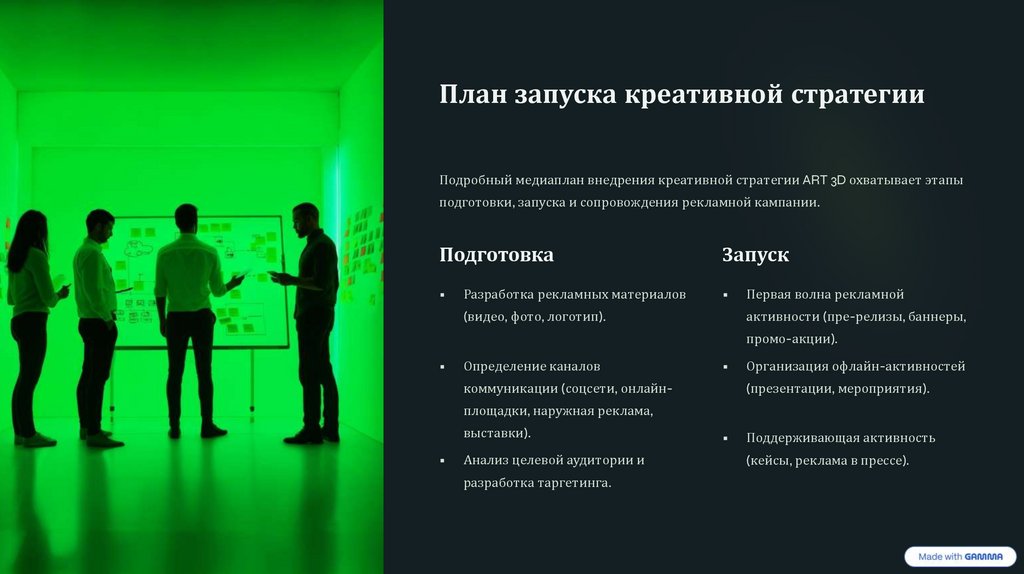 План запуска креативной стратегииПодробный медиаплан внедрения креативной стратегии ART 3D охватывает этапы