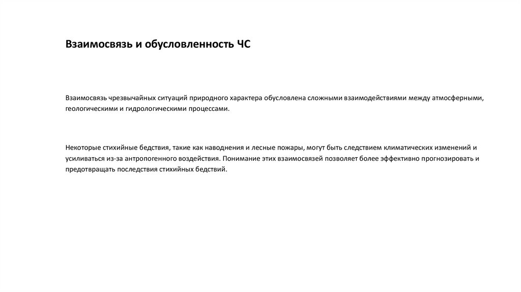 Взаимосвязь и обусловленность ЧСВзаимосвязь чрезвычайных ситуаций природного характера обусловлена сложными взаимодействиями между атмосферными,
