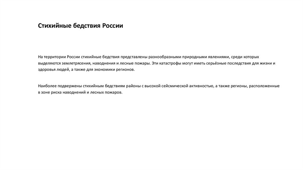 Стихийные бедствия РоссииНа территории России стихийные бедствия представлены разнообразными природными явлениями, среди которых