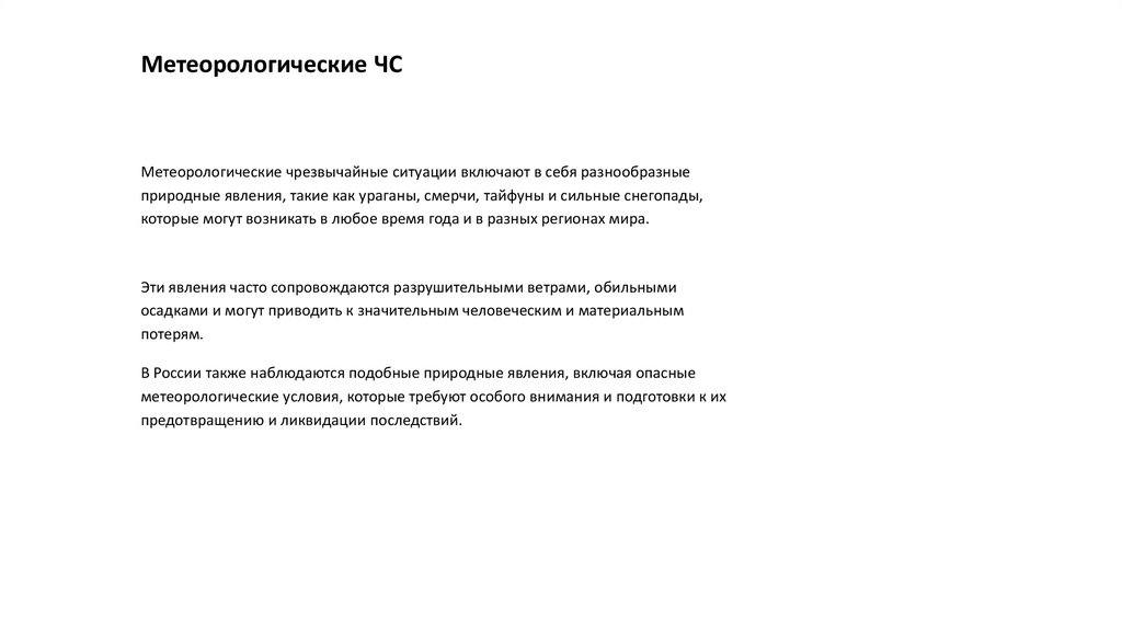 Метеорологические ЧСМетеорологические чрезвычайные ситуации включают в себя разнообразные